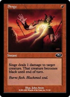 Singe wordt een Shock i.c.m. Urborg Shambler en kan Amphibious Kavu +3/+3 geven. Verder is dit ook het ideale deck om Illusion // Reality in the spelen. Helaas maakt dat het deck wel 4 kleuren, dus dan komt al meteen Chromatic Sphere om de hoek kijken...